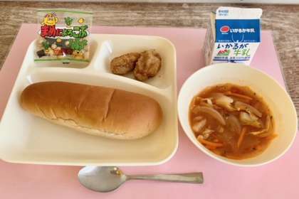 【黒糖パン、一口トンカツ、ミネストローネ、豆こんぶ、牛乳】