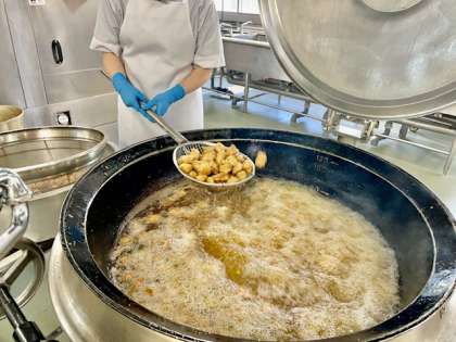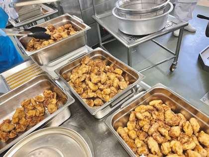 一口トンカツは、鹿児島県産の豚肉に、ワイン、塩、オールスパイスで下味をつけ、卵アレルギー児童も食べられるように卵を使用しない衣をつけ、なたね油であげています。(写真2、3枚目)
