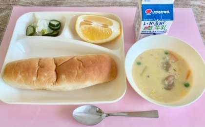 【おさつパン、コーンクリームシチュー、キャベツときゅうりのサラダ、かわちばんかん、牛乳】
