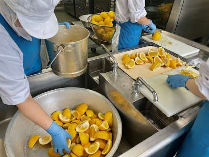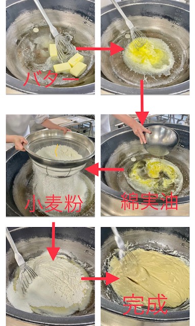 コーンクリームシチューは、鶏肉を主材に、粒のコーンとクリーム状のスイートコーンを使ったクリームシチューです。手作りホワイトルウは、バター、綿実油で風味よくしています。(写真2〜7枚目 ホワイトルウを作る様子)