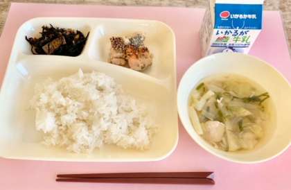 【ごはん、さけのごまみそ焼き、五目汁、ひじきのいため煮、牛乳】