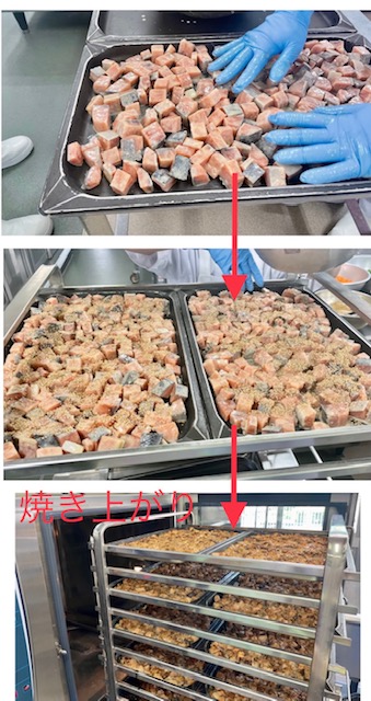 さけのごまみそ焼きは、角切りのさけを、ねりごま、砂糖、うすくちしょうゆ、白みそで下味をつけ、いりごまをふり、焼き物機で焼いています。コクのある味つけで、ごはんがすすむ一品です。(写真2、3、4枚目)