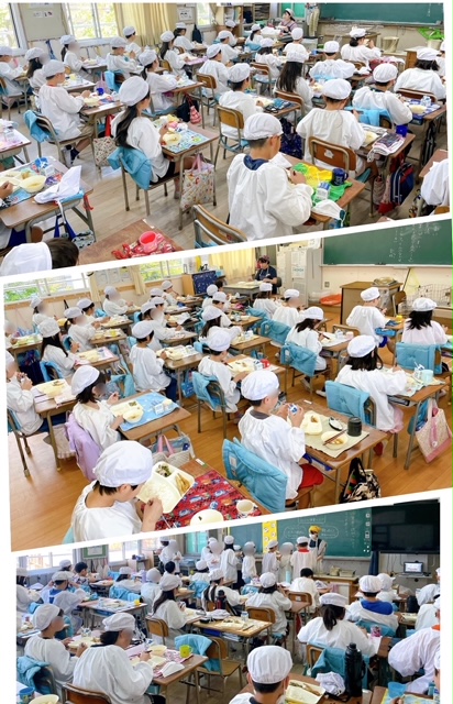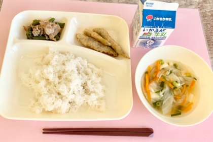 【ごはん、いわしてんぷら、五目汁、豚肉とさんどまめのいためもの、牛乳】