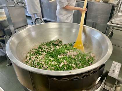 五目汁は、とうふ、キャベツ、たまねぎ、にんじん、青みに青ねぎを使用しています。