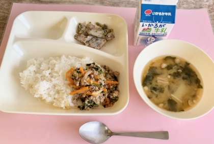 【豚ひき肉とにらのそぼろ丼、みそ汁、キャベツの赤じそあえ、牛乳】