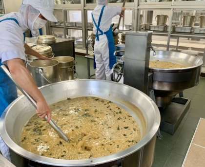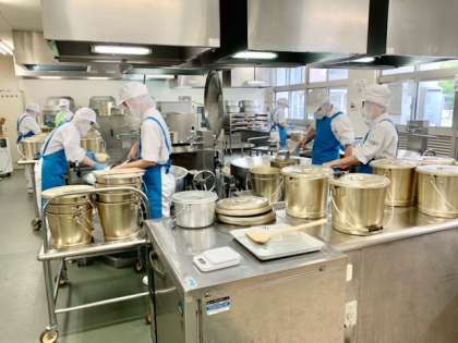 給食調理室内はエアコンがない上に火を使うので、とても暑いですが、「子どもたちに給食をおいしく食べてほしい」という思いで、毎日頑張って調理してくださっています。(写真3枚目)
