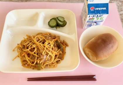 【黒糖パン1/2、スパゲッティミートソース、きゅうりのピクルス、牛乳】
