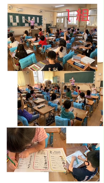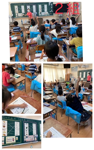 1年生は、食に関する指導として「たべもののなまえをおぼえよう」をテーマに、様々な食べ物の名前を覚えるとともに、食べ物には、体に吸収された後の働きが大きく分けて3つあることを学びました。