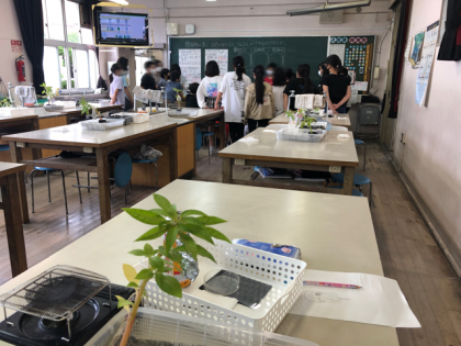 植物の葉に日光が当たるとでんぷんができるのかについて実験を行います。実験の方法や注意事項を聞いて、実験を始めます。