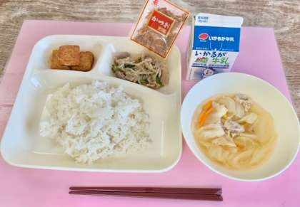 【ごはん、ゴーヤチャンプルー、すまし汁、あつあげのしょうがじょうゆかけ、牛乳】