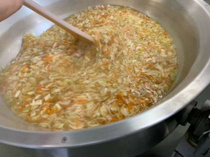 すまし汁は、鶏肉を主材に、キャベツ、たまねぎ、にんじんを使用しています。(写真2枚目)
