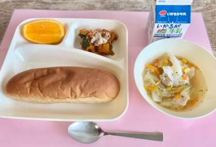 【黒糖パン、かぼちゃのミートグラタン、スープ、オレンジ、牛乳】