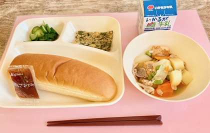 【大型コッペパン、いちごジャム、もずく入りヒラヤーチー、豚肉とあつあげの煮もの、あっさりきゅうり、牛乳】