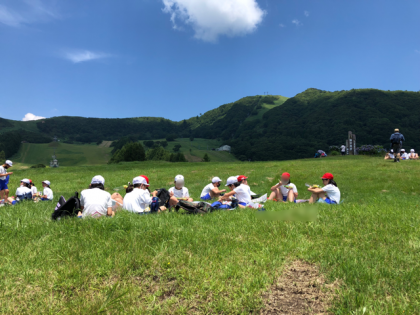 高原でお弁当を食べています。日差しは強いですが、風は気持ちいいです。