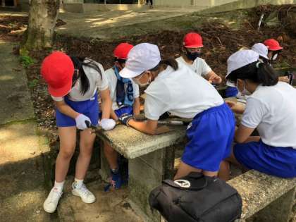 杉の枝などを切って磨いて、思い出のキーホルダー作りです。仲間と協力し合って活動しています。