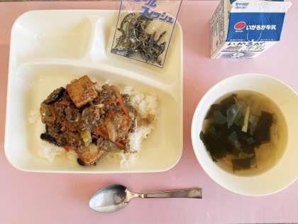 【マーボーあつあげ丼、中華スープ、ミニフィッシュ、牛乳】