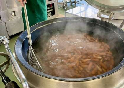 フランクフルトのケチャップソースは、フランクフルトをゆで、ケチャップ、デミグラスソース、ウスターソースを合わせ、でんぷんでとろみをつけたソースをかけています。(写真2枚目)
