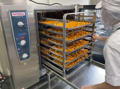 焼きかぼちゃは、北海道産のかぼちゃに塩で下味をつけ、焼き物機で蒸し焼きにしています。(写真3枚目)