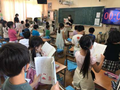 ものの言葉から発想する擬態語や擬声語を使った文章を音読しました。体を使った音読によって楽しみながら、語彙を増やしていきました。