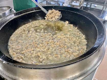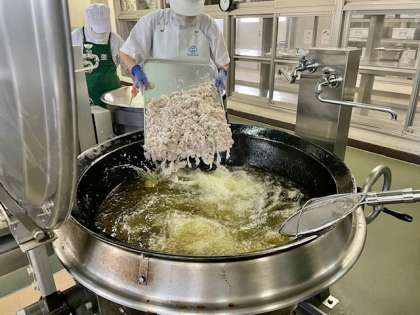 鶏肉のからあげは、鶏肉に、にんにく、しょうが汁、塩、こしょうで下味をつけ、でんぷんをまぶし、なたね油であげています。
