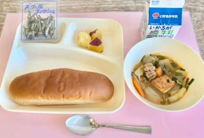 【黒糖パン、豚肉といかの中華煮、大学いも、ミニフィッシュ、牛乳】