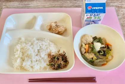 【ごはん、鶏肉のたつたあげ、一口がんもと野菜の煮もの、おかかなっ葉、牛乳】