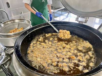 鶏肉のたつたあげは、しょうが汁、料理酒、こいくちしょうゆで下味をつけることで、風味、色合いよく仕上げています。子どもたちに大人気の献立です。(写真2枚目)