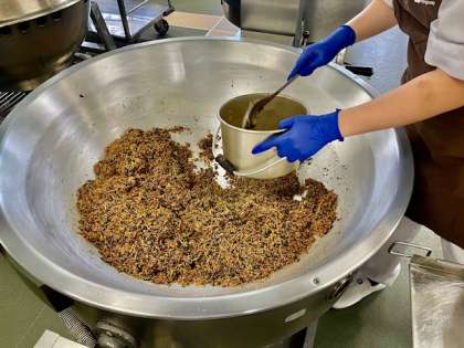 おかかなっ葉は、かつおぶし、だいこん葉をいため、みりん、こいくちしょうゆで味つけし、最後にいりごまを加えた、ごはんによく合う一品です。(写真3枚目)