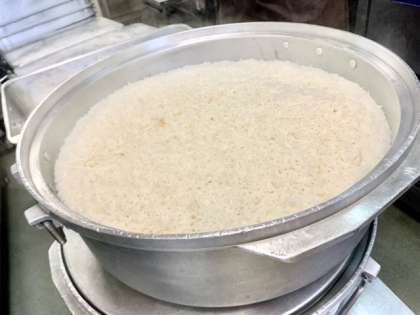 写真3枚目 あつあつのごはんをクラスごとに分ける様子