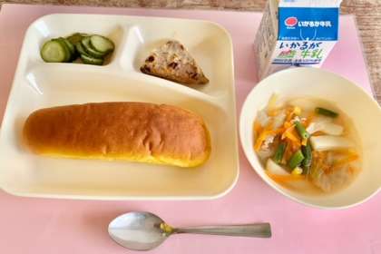 【パンプキンパン、かつおのマリネ焼き[ノンエッグドレッシング]、鶏肉とじゃがいものスープ、きゅうりのサラダ、牛乳】