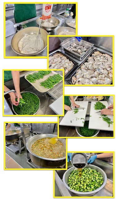 かつおのマリネ焼き[ノンエッグドレッシング]は、卵アレルギーのある児童も食べることができるマヨネーズ風味のノンエッグドレッシングを使っています。(写真2枚目)塩、こしょう、ノンエッグドレッシングで下味をつけたかつおを焼き物機で焼いています。(写真3枚目)