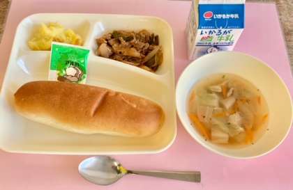 【大型コッペパン、ソフトマーガリン、豚肉と野菜のケチャップソテー、スープ、スイートポテト、牛乳】