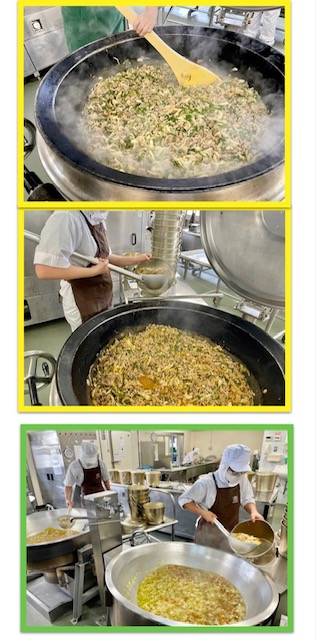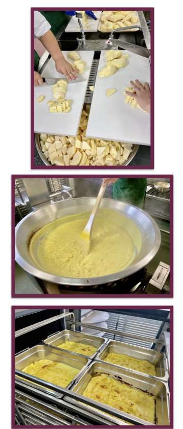 スイートポテトは、子どもたちに人気の手作りデザートです。煮崩れるまでやわらかく煮たさつまいもに、砂糖、バター、牛乳、クリームを加えて煮た後、焼き物機に入れて焼いています。(写真5〜7枚目)