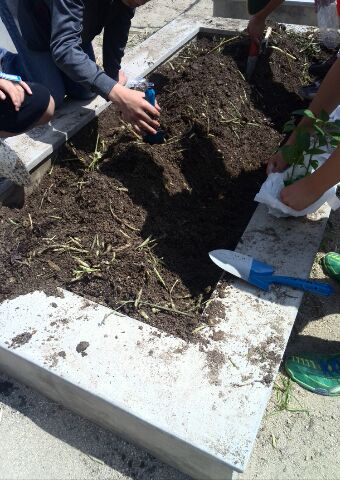 みんなで「なすび」「オクラ」「ミニトマト」「ピーマン」などの苗を植えました。
