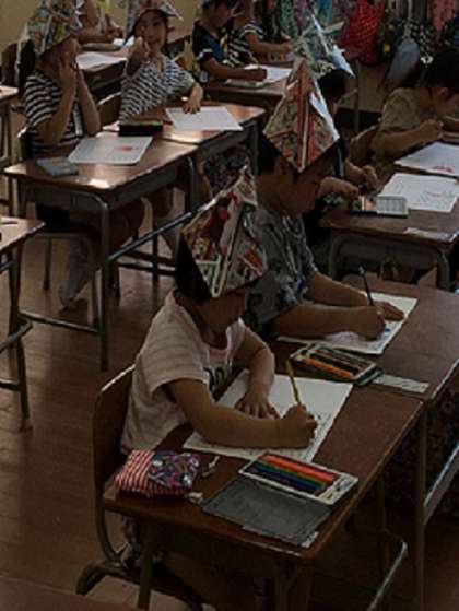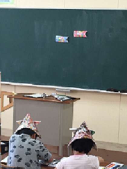 この日の1年生は、こいのぼりを作成しました。いただいた兜をかぶって、楽しんで作っていました。
