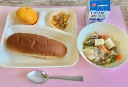【黒糖パン、豚肉と野菜のスープ煮、変わりピザ、みかん、牛乳】