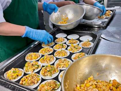 変わりピザは、ツナ、コーン、ピーマン、ピザソース、チーズを混ぜ合わせた具をぎょうざの皮に乗せ、焼き物機で焼いています。(写真2枚目 : 1枚ずつ丁寧に具を乗せている様子)
