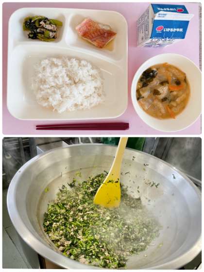 こまつなのいためものは、豚肉とこまつなを炒め、調味料で味付けしています。こまつなは、カロテンを多く含む野菜です。またカルシウム、鉄など不足しやすい栄養素も含んでいます。