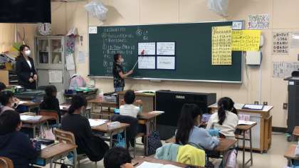 1年生は、繰り下がりのある引き算、2年生は、九の段の九九を使った計算、それぞれ計算方法について、自分の考えをまとめ、みんなに説明しています。