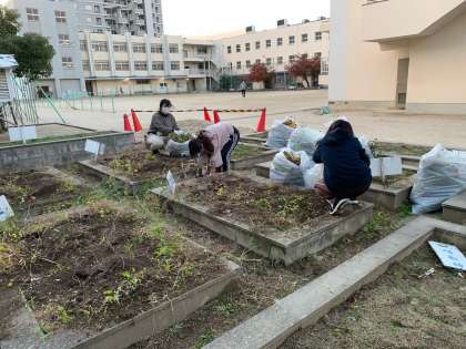 今日の放課後は、3年生は学習を終えたマリーゴールドを抜き、4年生は5年生の学習で使う油菜を植えました。