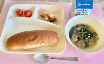 【黒糖パン、さけのマリネ、肉だんごと麦のスープ、プチトマト、牛乳】