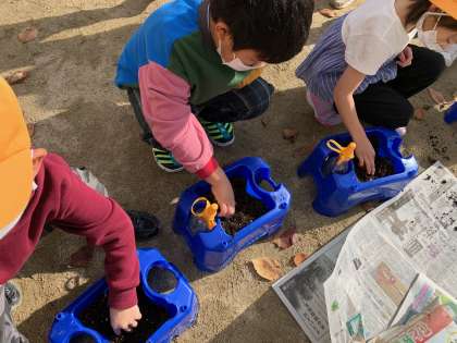 生活科の学習で、チューリップの球根を植えました。赤、白、黄色、ピンクなどお気に入りの色を選んで上手に植えることができました。来年、咲く日がとっても楽しみです。