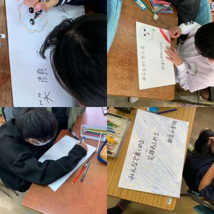 キャッチコピーを考えたり、新高小学校のキャラクターふわりちゃんを描いたり、より良い学校にする為に5.6年生が協力していました。
