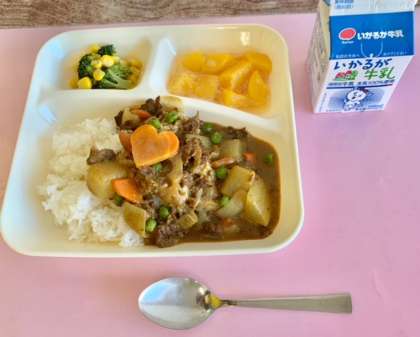 【冬野菜のカレーライス、ブロッコリーとコーンのサラダ、黄桃(カット缶)、牛乳】