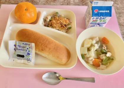 【大型コッペパン、ブルーベリージャム、鶏肉とじゃがいものスープ煮、きのこのドリア、みかん、牛乳】