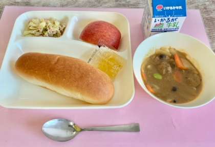 【大型コッペパン、マーマレード、ミートボールと野菜のカレー煮、ツナとキャベツのソテー、りんご、牛乳】
