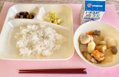 【ごはん、関東煮、はくさいの甘酢あえ、とら豆の煮もの、牛乳】