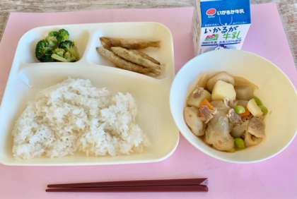 【ごはん、きびなごてんぷら、一口がんもとじゃがいもの煮もの、ブロッコリーのしょうがづけ、牛乳】