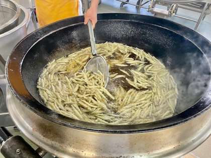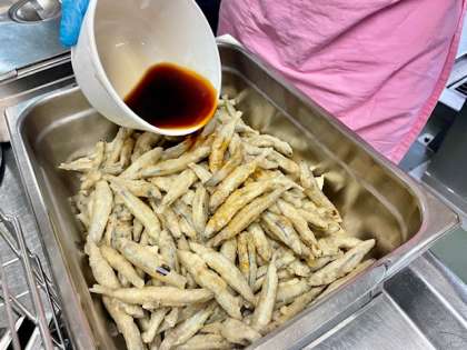 きびなごてんぷらは、きびなごのてんぷらに、みりんとこいくちしょうゆで作ったタレをかけています。1年生にも好評で、おかわりにたくさん手があがっていました。
