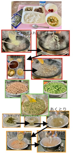 すまし汁はとうふ、だいこん、にんじん、しいたけ、彩りにみつばを組み合わせています。(写真9〜13枚目)